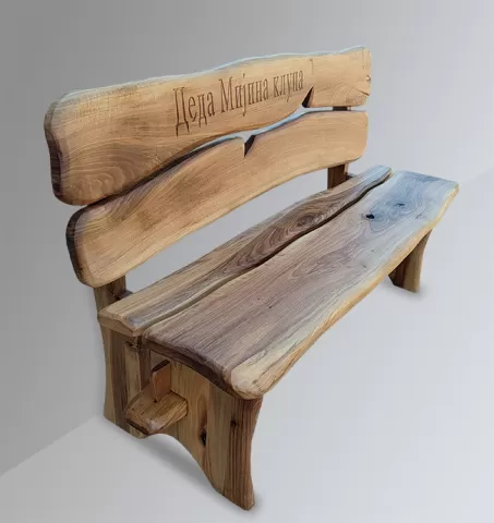 Naslon i sedalni deo izrađeni su od masivnih dasaka sa prirodnim oblinama, dok je konstrukcija stabilna i čvrsta, pogodna za dugogodišnje korišćenje. Na naslonu je urezan natpis, što klupi daje personalizovan i emotivan karakter – idealna je za dvorišta, vikendice, planinske kuće ili kao dekorativni komad u enterijeru.