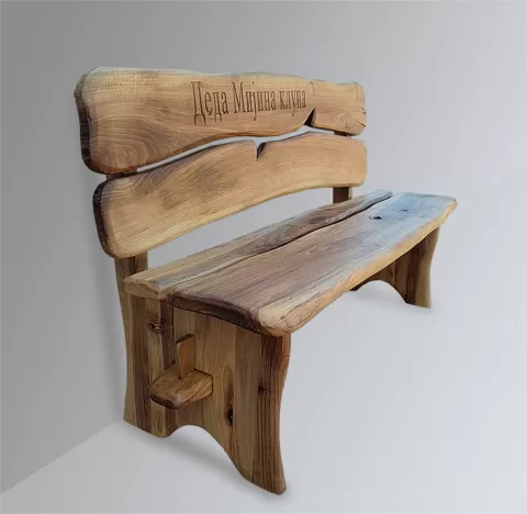 Naslon i sedalni deo izrađeni su od masivnih dasaka sa prirodnim oblinama, dok je konstrukcija stabilna i čvrsta, pogodna za dugogodišnje korišćenje. Na naslonu je urezan natpis, što klupi daje personalizovan i emotivan karakter – idealna je za dvorišta, vikendice, planinske kuće ili kao dekorativni komad u enterijeru.