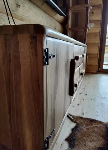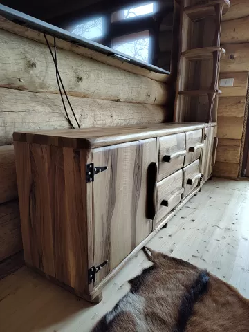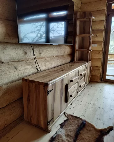 Ova komoda je izrađena od masivnog drveta, sa rustičnim izgledom koji se odlično uklapa u enterijere uređenje u stilu brvnara ili prirodnih prostora.